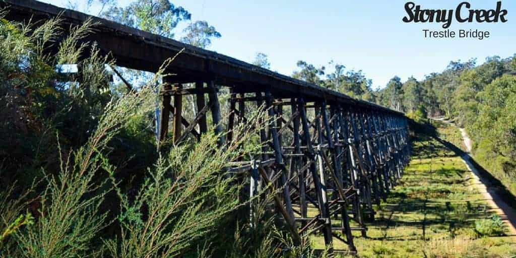 Building materials for the bridge included red ironbark and grey box timber. Stony Creek Trestle Bridge is a prime example of early engineering. Using skills and practises that utilised the resources and materials found on the site.